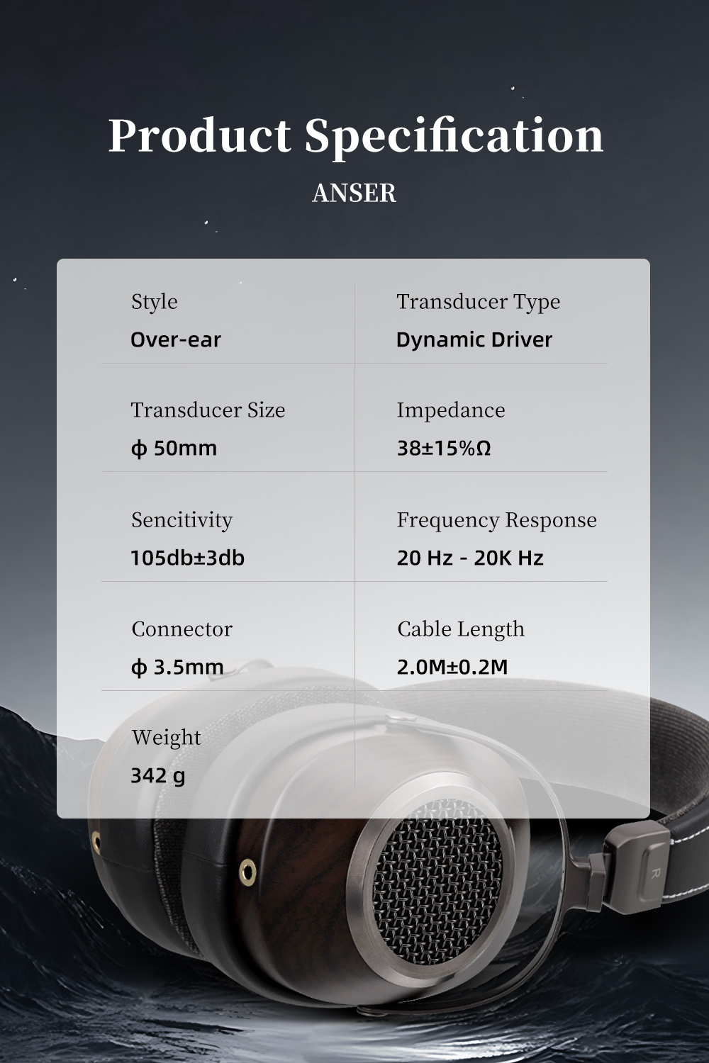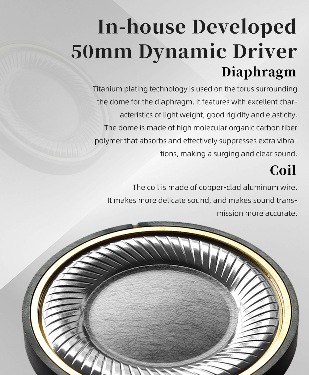 In-house developed 50mm dynamic driver for full bass, wide soundstage, natural and clean sound.